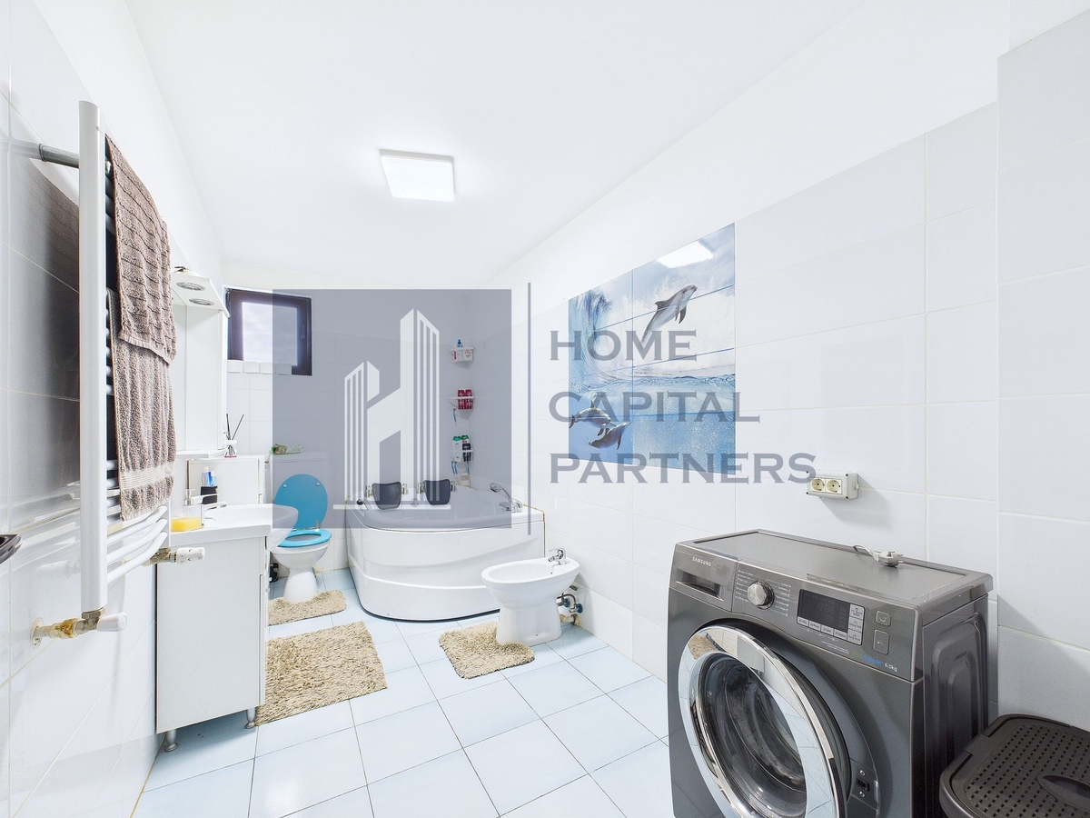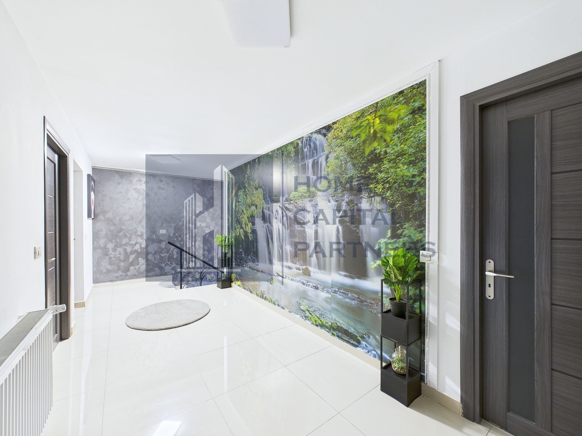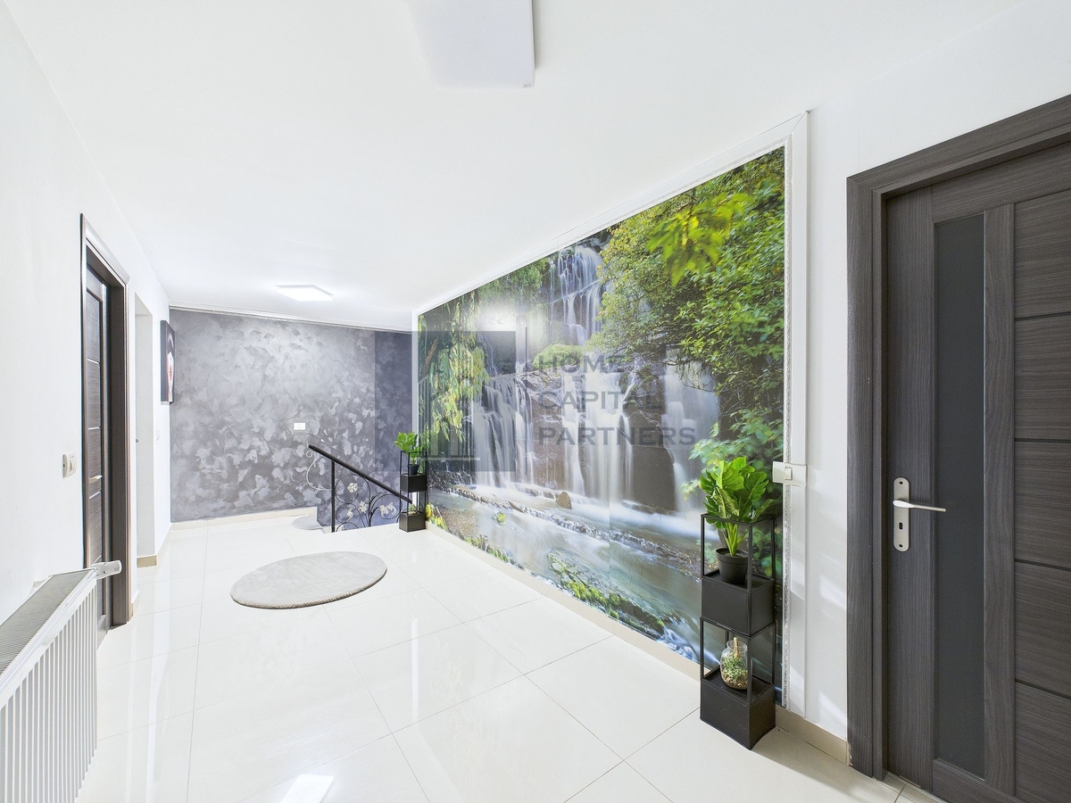 Parterul este dedicat zonei de zi: living cu lumina naturala si iesire catre terasa de la parter, loc optim pentru masa in aer liber. Bucataria este separata, cu spatiu functional, iar baia de serviciu deserveste zona de zi. Etajul reuneste 4 dormitoare, configurate pentru odihna si intimitate, o baie si un balcon ce completeaza confortul nivelului superior.