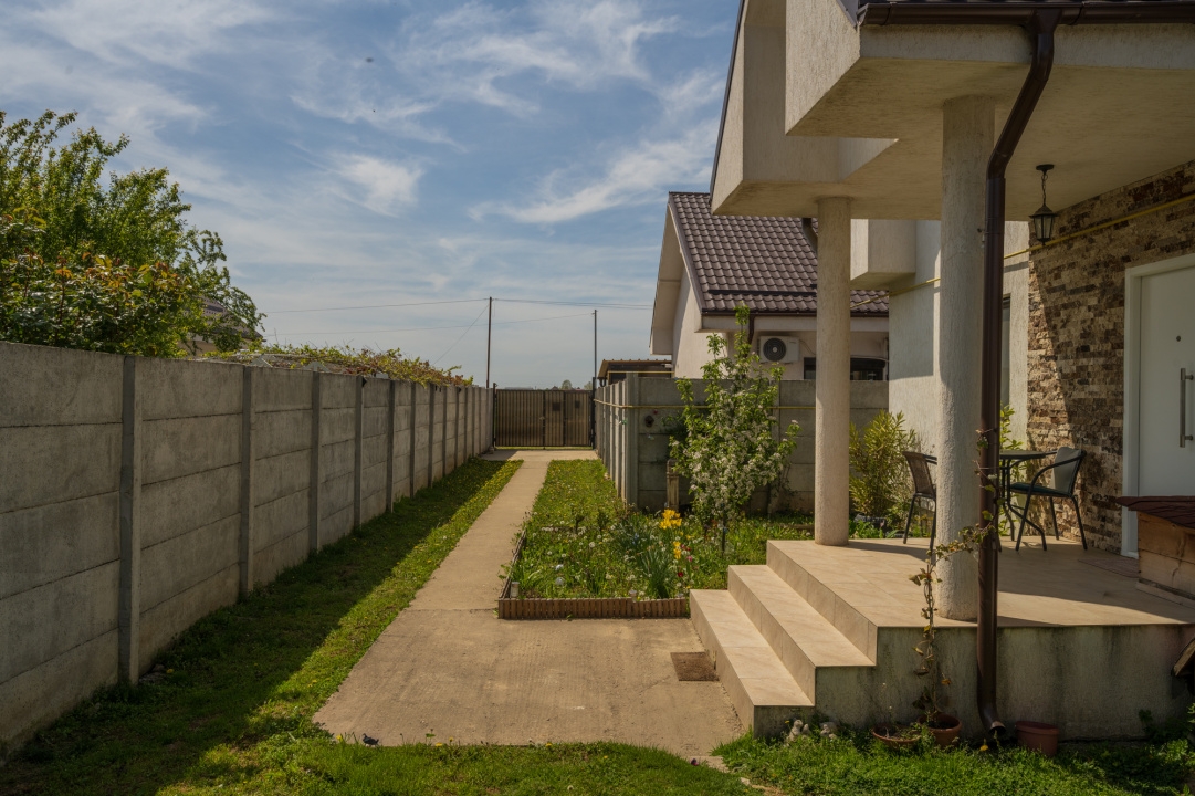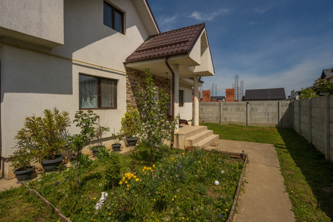 Curtea nu este foarte mare, dar este bine ingrijita, amenajata cu flori si pomi fructiferi. Se poate amenaja si un foisor, exista o zona potrivita chiar in fata casei. Terenul este in forma de L, cu o alee la intrarea dinspre strada (care face parte din proprietate, respectiv din lotul de teren al casei), zona in care s a amenajat un loc pentru parcat 1-2 masini.