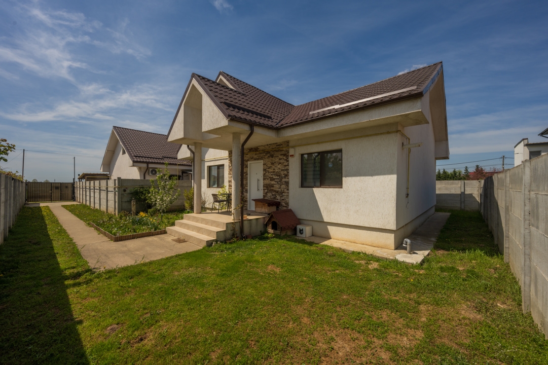 Casa este finisata, dotata cu centrala termica proprie pe gaz ( Ariston in condensatie 23kw) si incalzire prin calorifere din otel, ferestre cu geam termopan si tamplarie pvc, plase de insecte la toate ferestrele, sistem de alarma, usi interioare moderne. Pardoselile sunt placate cu parchet laminat in camere si gresie in hol, baie si bucatarie. Instalatia electrica este pe conductori din cupru (2,5mmp grosime). Proprietatea este in stare foarte buna, a fost locuita 5 ani de proprietari si este extrem de bine intretinuta si nu necesita niciun fel de reparatii sau retusuri, cu exceptia amenajarii podului.