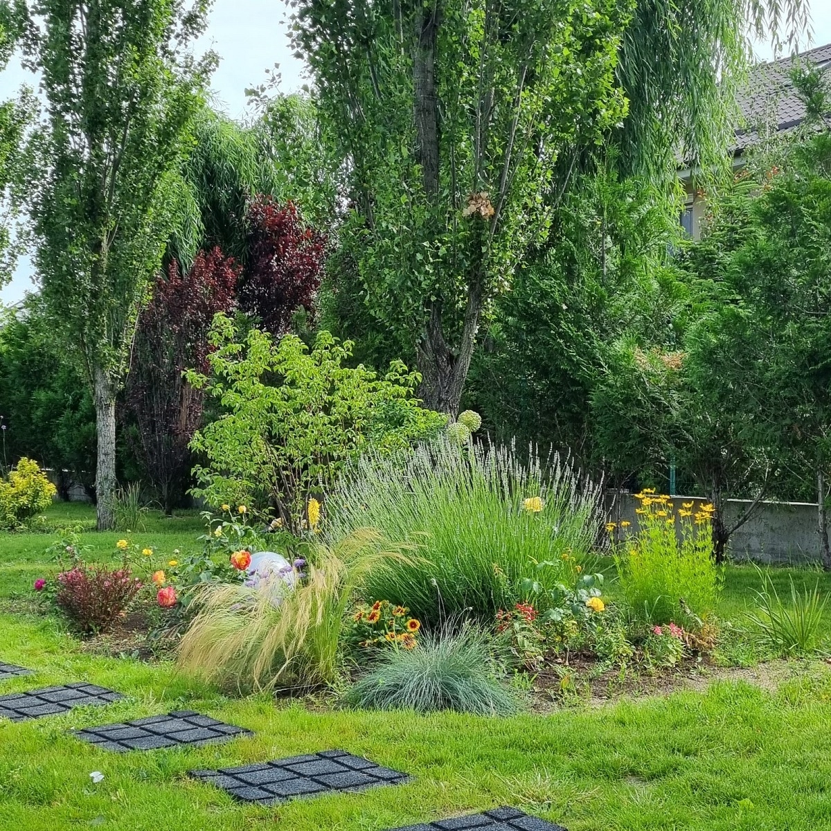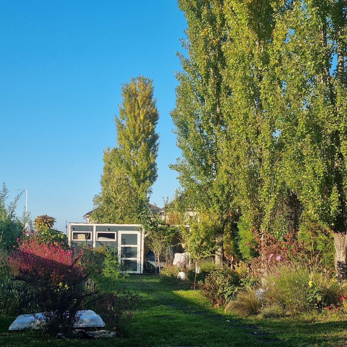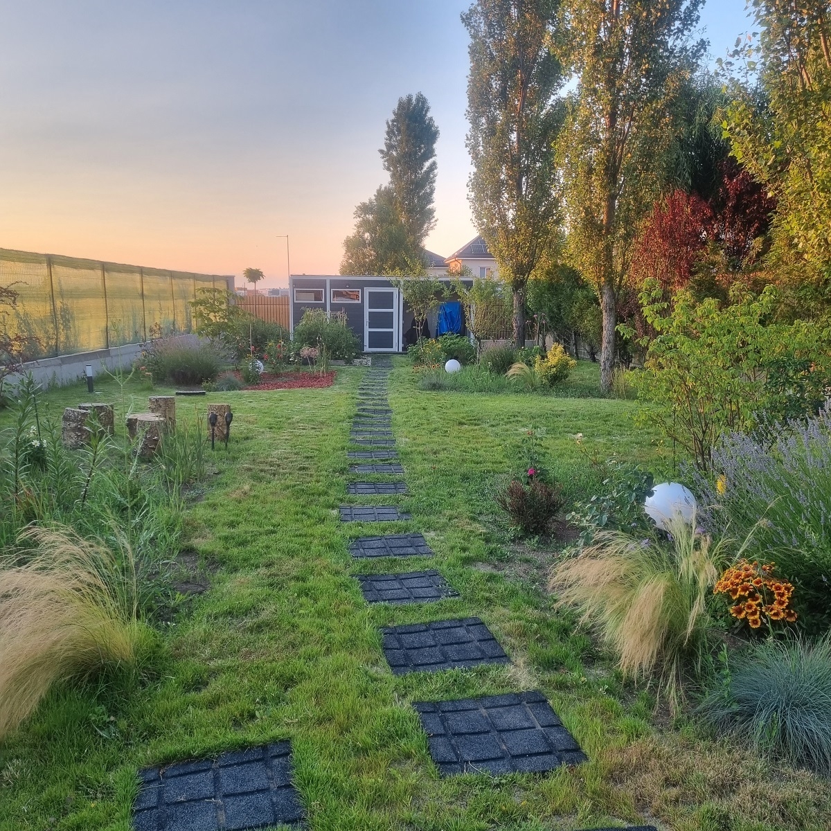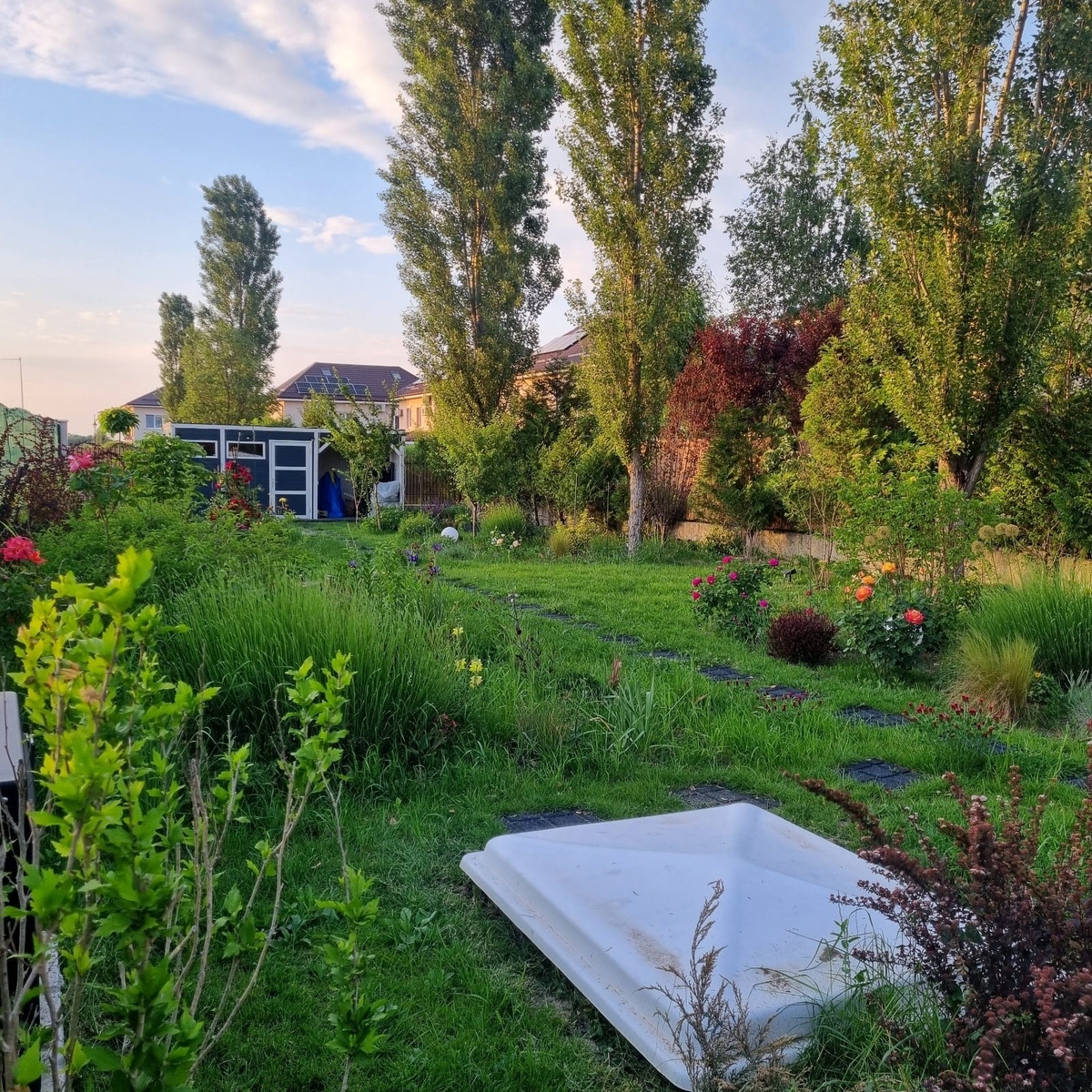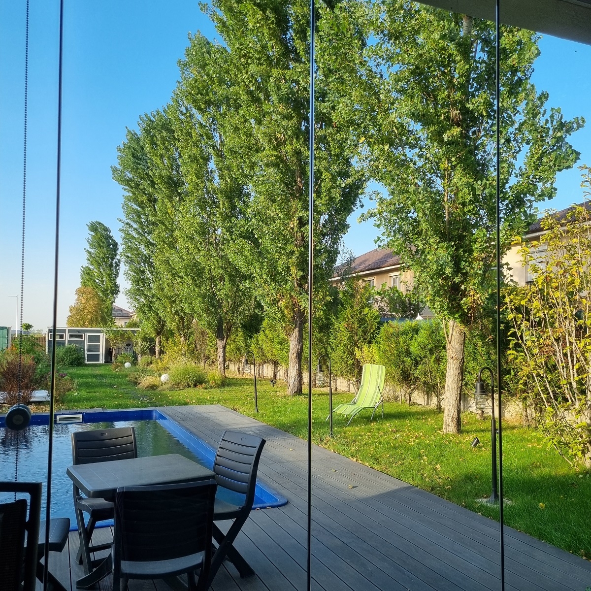 Gradina este amenajata cu mult gust, avand gazon, vegetatie matura, gradina de legume si pomi fructiferi, sistem automat de irigatie, beci pentru instalatiile tehnice, casa de gradina cu terasa si iluminat exterior. De asemenea, proprietatea dispune de o piscina marca Ave Piscine, dotata cu: