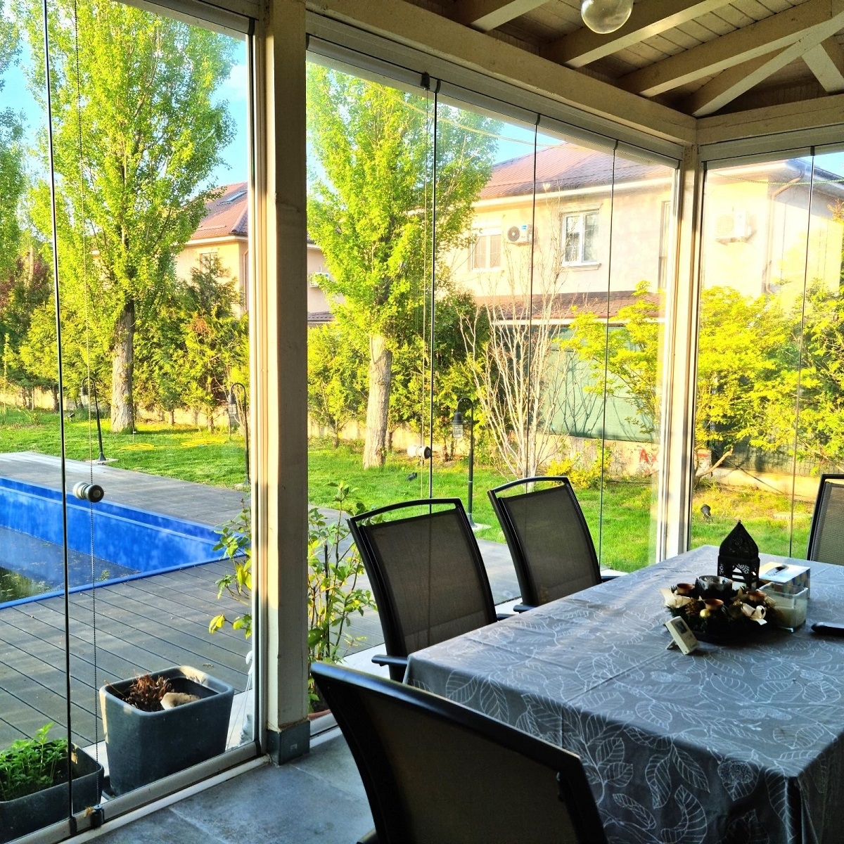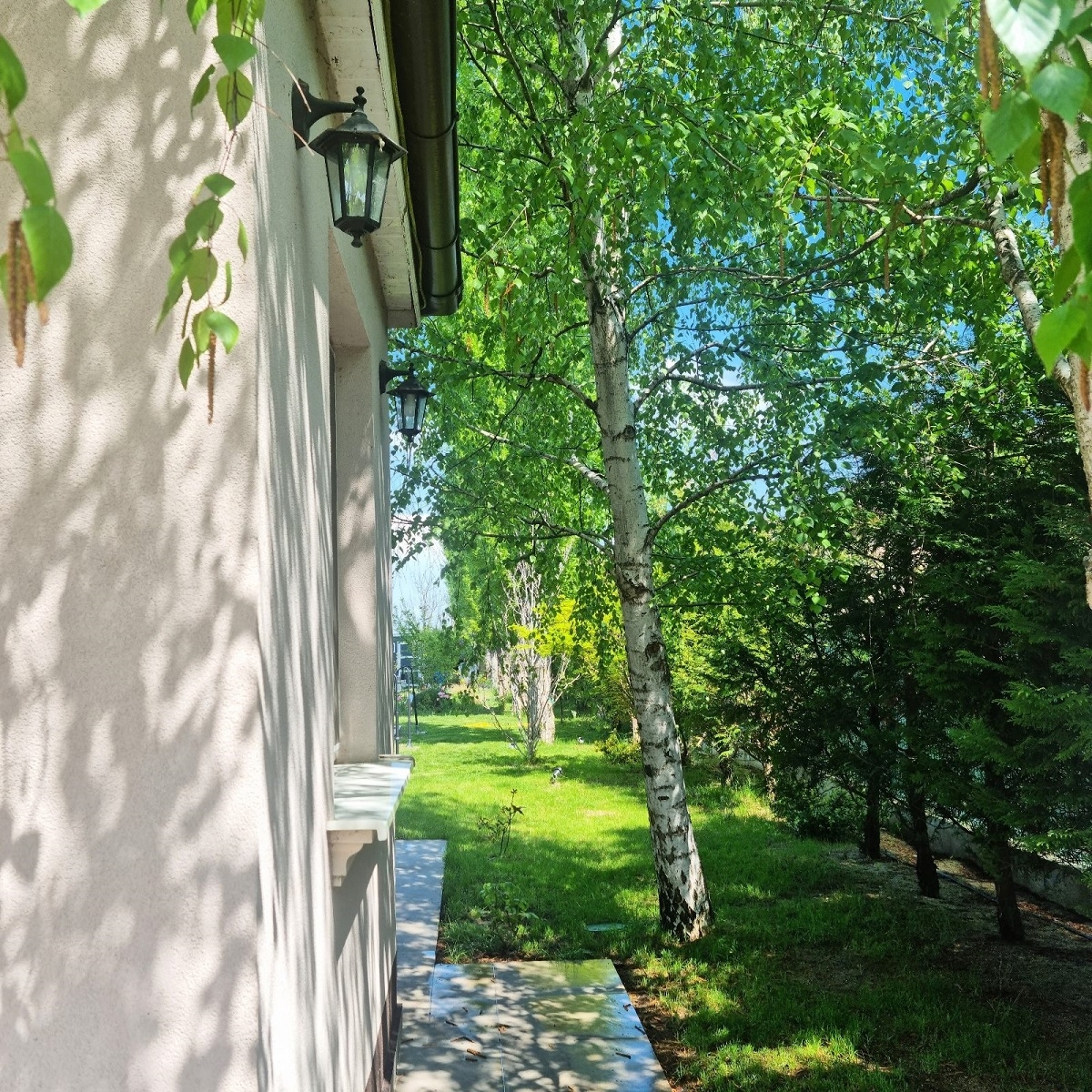 Proprietatea pe care o prezentam se remarca prin dotarile si facilitatile deosebite: teren generos de 711 mp, rezultat din alipirea a trei parcele, piscina, terasa si o casa de gradina cu terasa proprie. Curtea este marginita pe toata lungimea de plopi si mesteceni maturi, oferind un peisaj spectaculos si o atmosfera relaxanta.