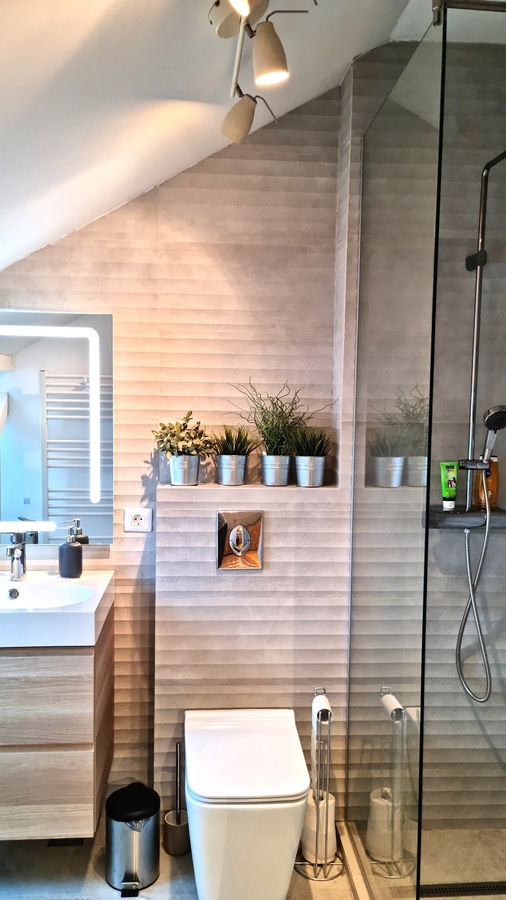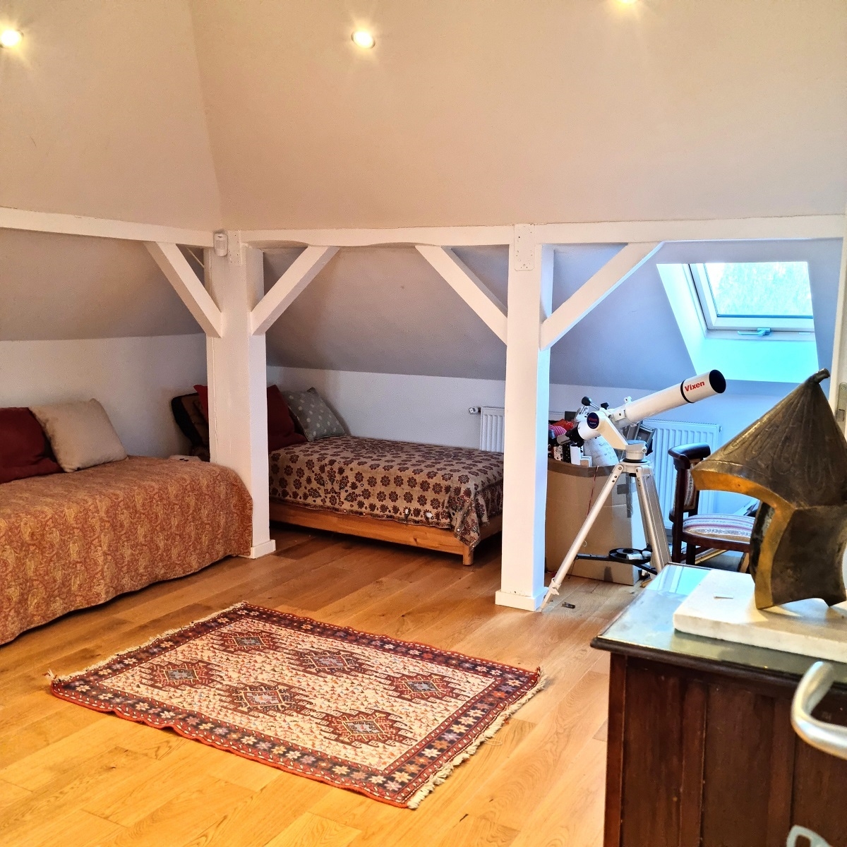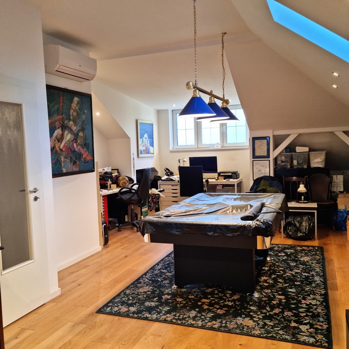 - Mansarda, folosita in prezent ca birou si zona de entertainment, este foarte bine luminata de cele trei ferestre Velux ca si de ferestrele normale cu vedere la gradina. Este amenajata cu gust, ca si restul casei si in acest moment este folosita ca birou si pentru relaxare. Este dotata cu baie si poate fi compartimentata in doua dormitoare sau folosita pentru activitati recreative.