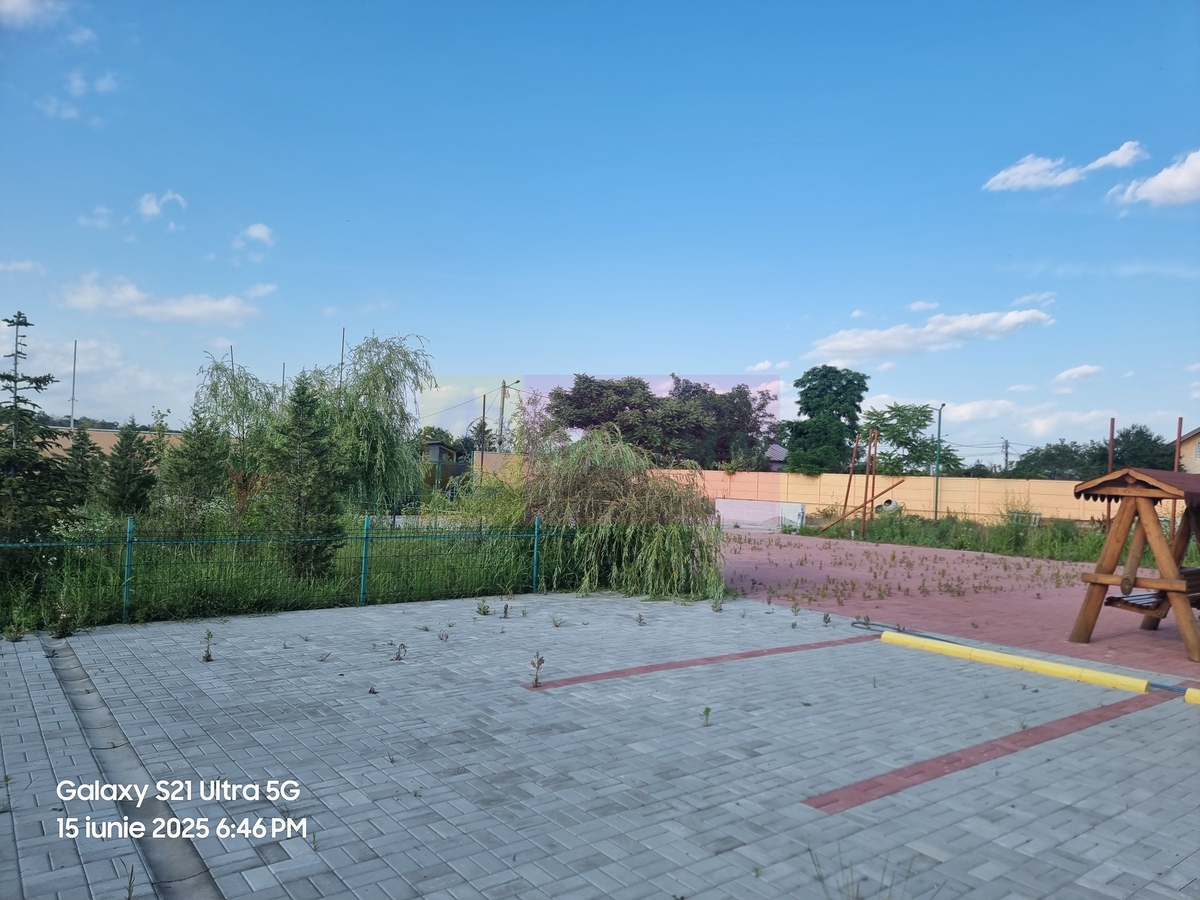 Curtea e pavata, are 2 intrari, are si spatiu verde cu parcari pt auto normale (inclusiv pt auto electrice), cabina pt agent de paza, zona de gratar si grupuri sanitare la exterior.