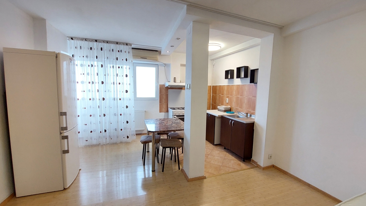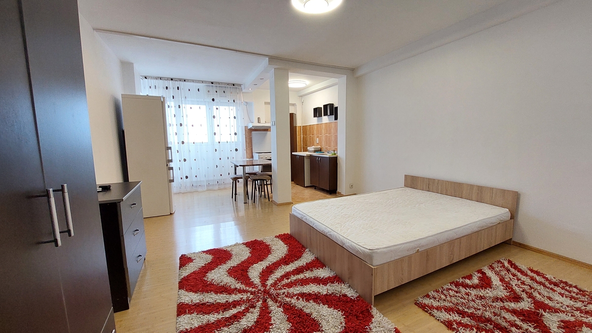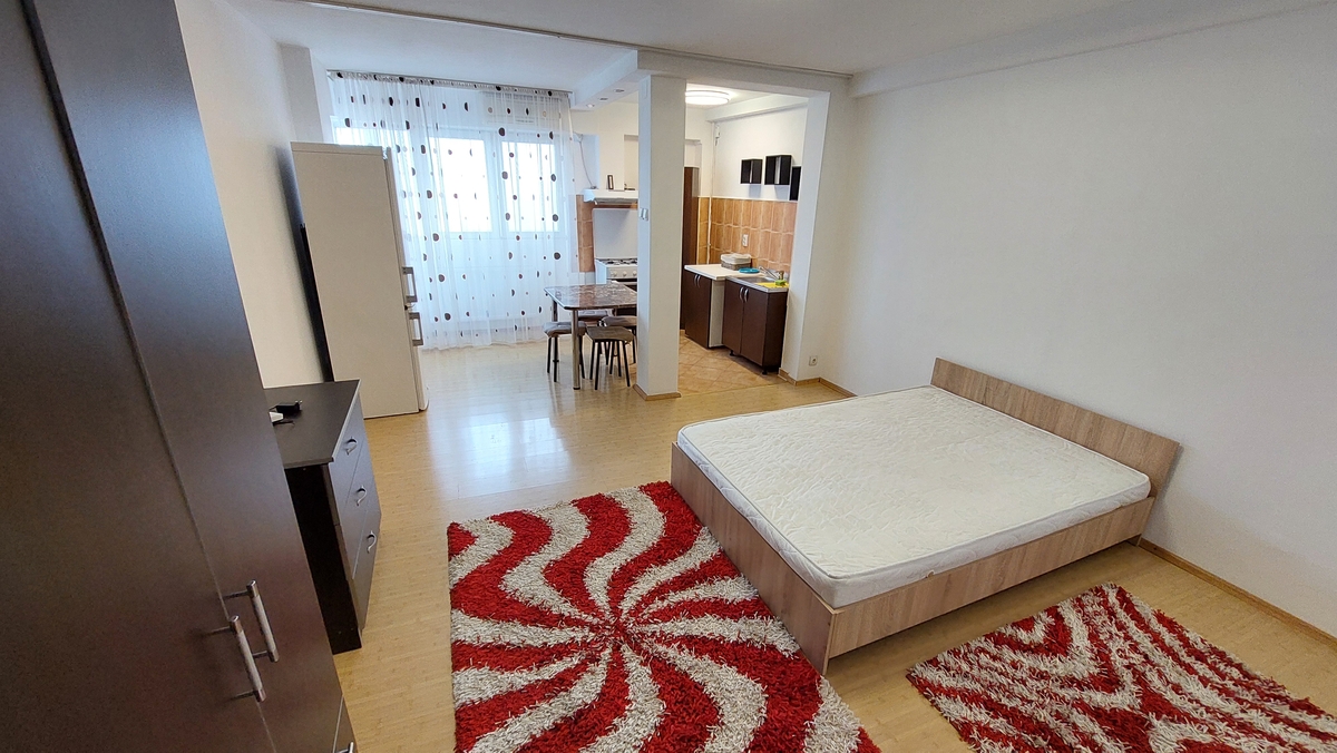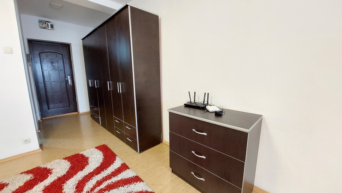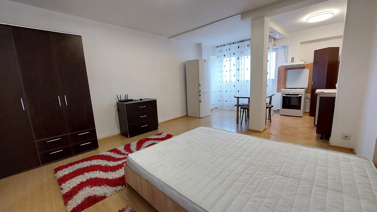 Garsoniera renovata, amenajata modern, foarte curata, mobilata si utilata complet (pat de mijloc, aragaz, frigider, masina de splat rufe, dressing etc.).