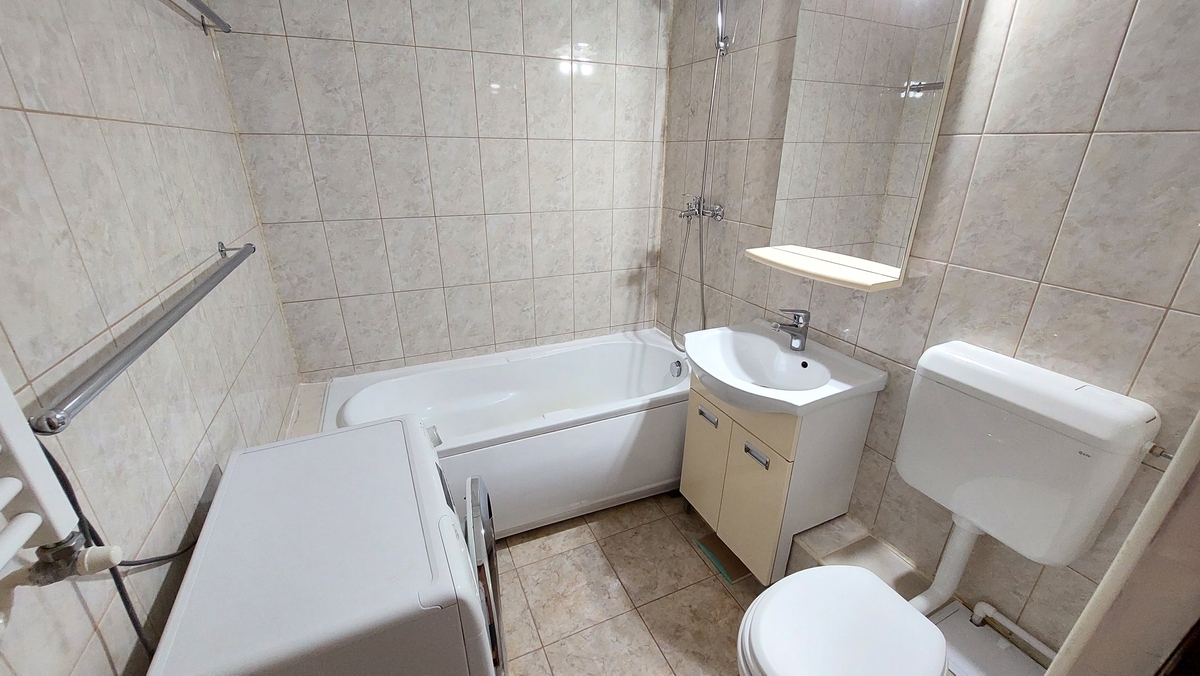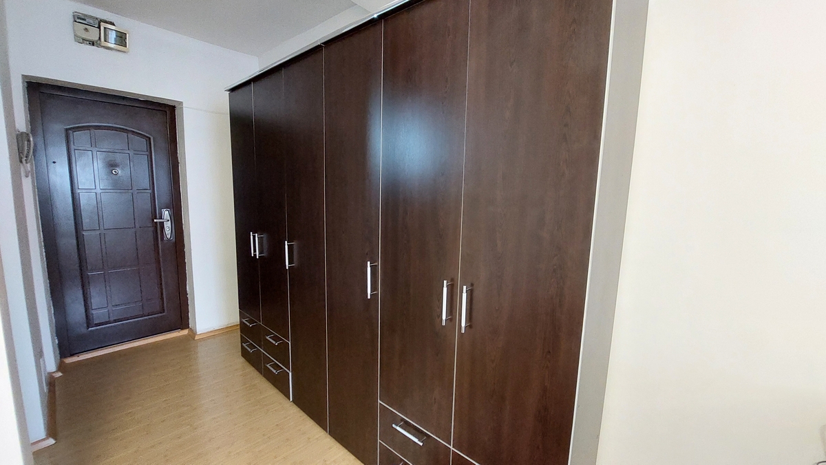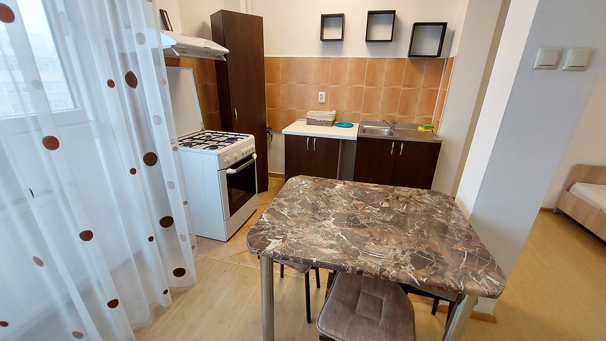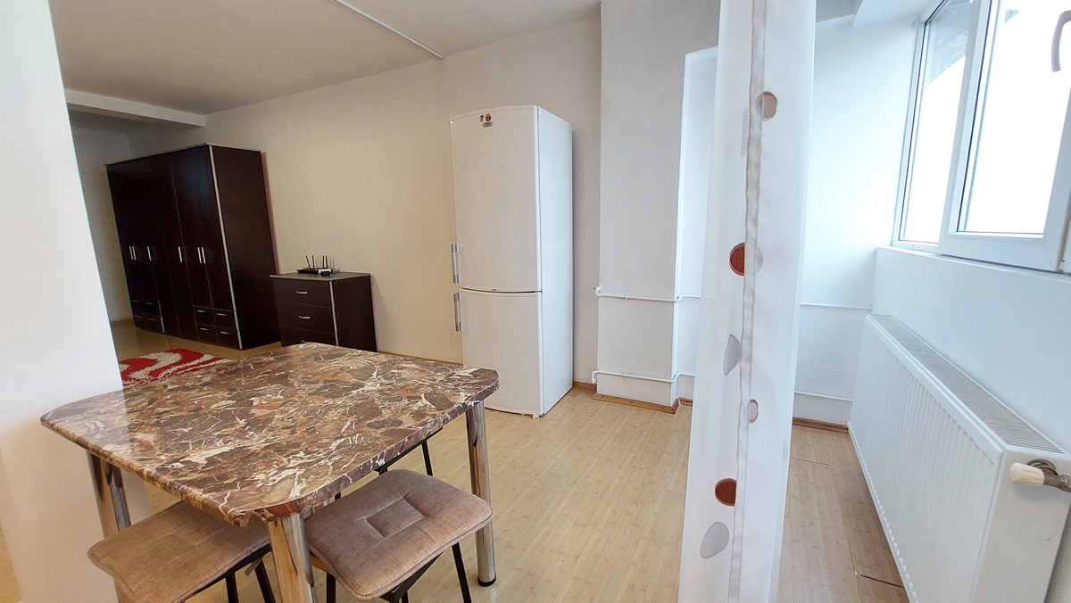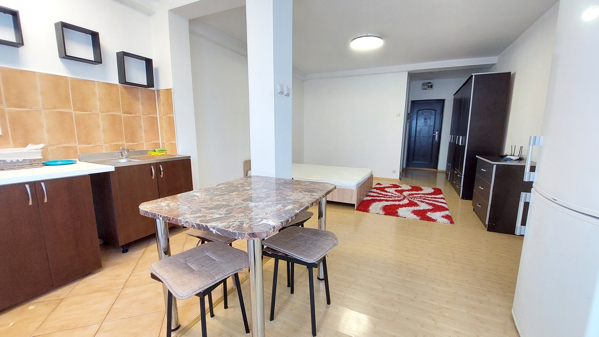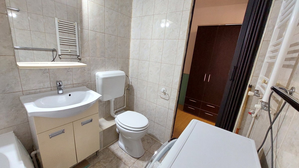 Garsoniera renovata, amenajata modern, foarte curata, mobilata si utilata complet (pat de mijloc, aragaz, frigider, masina de splat rufe, dressing etc.).