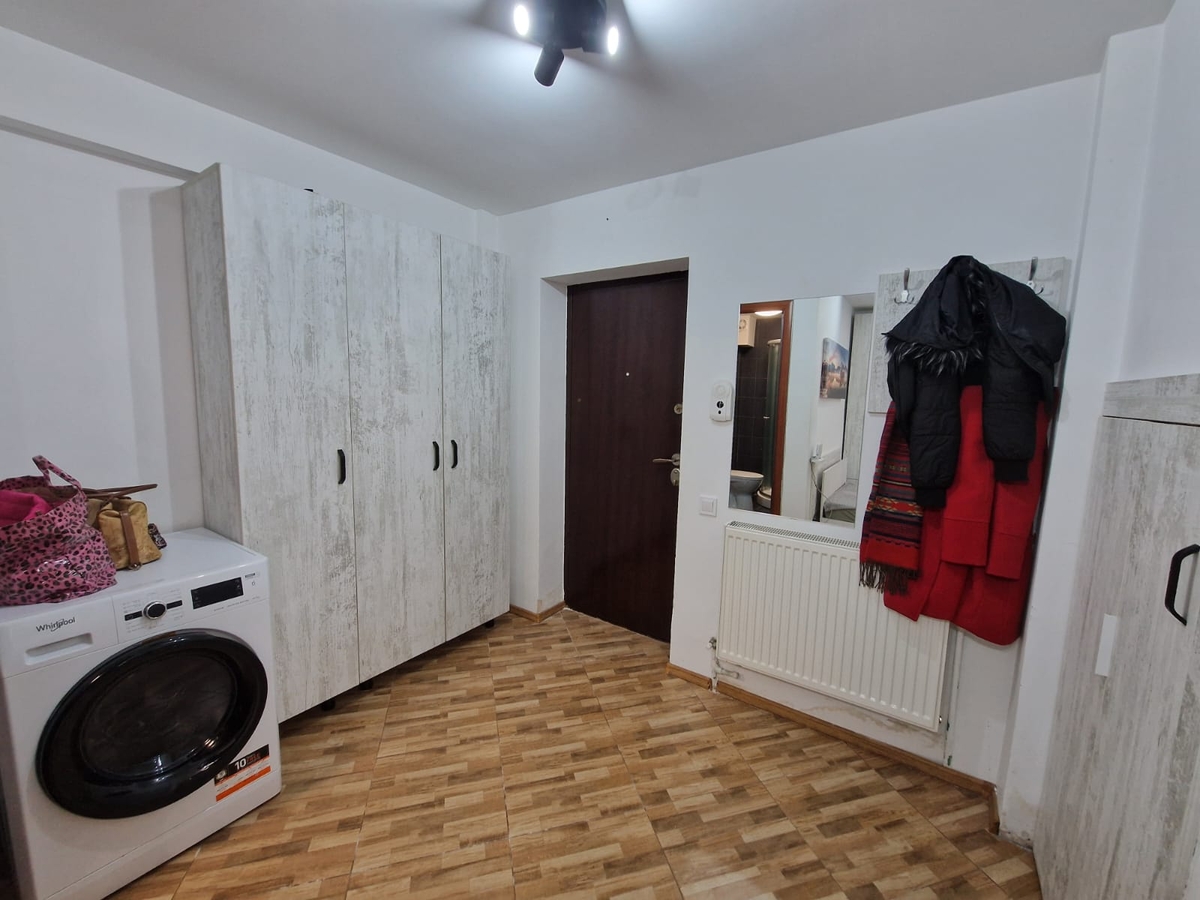 Hol de intrare generos, baie cu dus, camera de depozitare si camera principala cu bucatarie open-space.