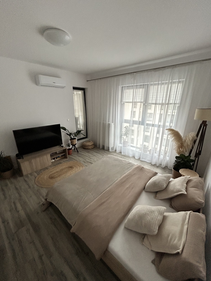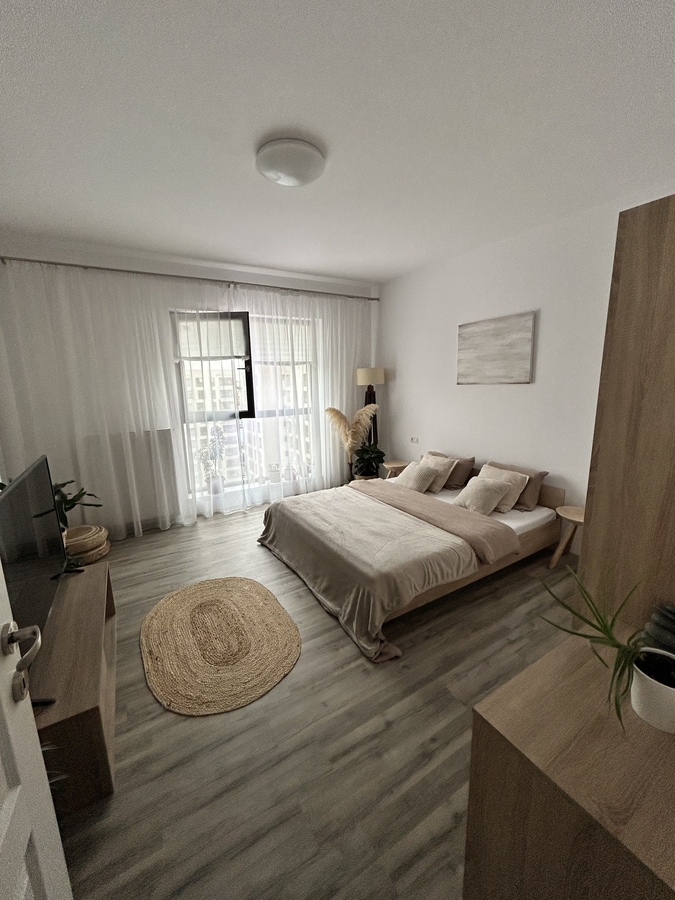 Apartamentul are vedere libera catre curtea blocului, si catre albastru cerului, fiind plin de luminozitate.