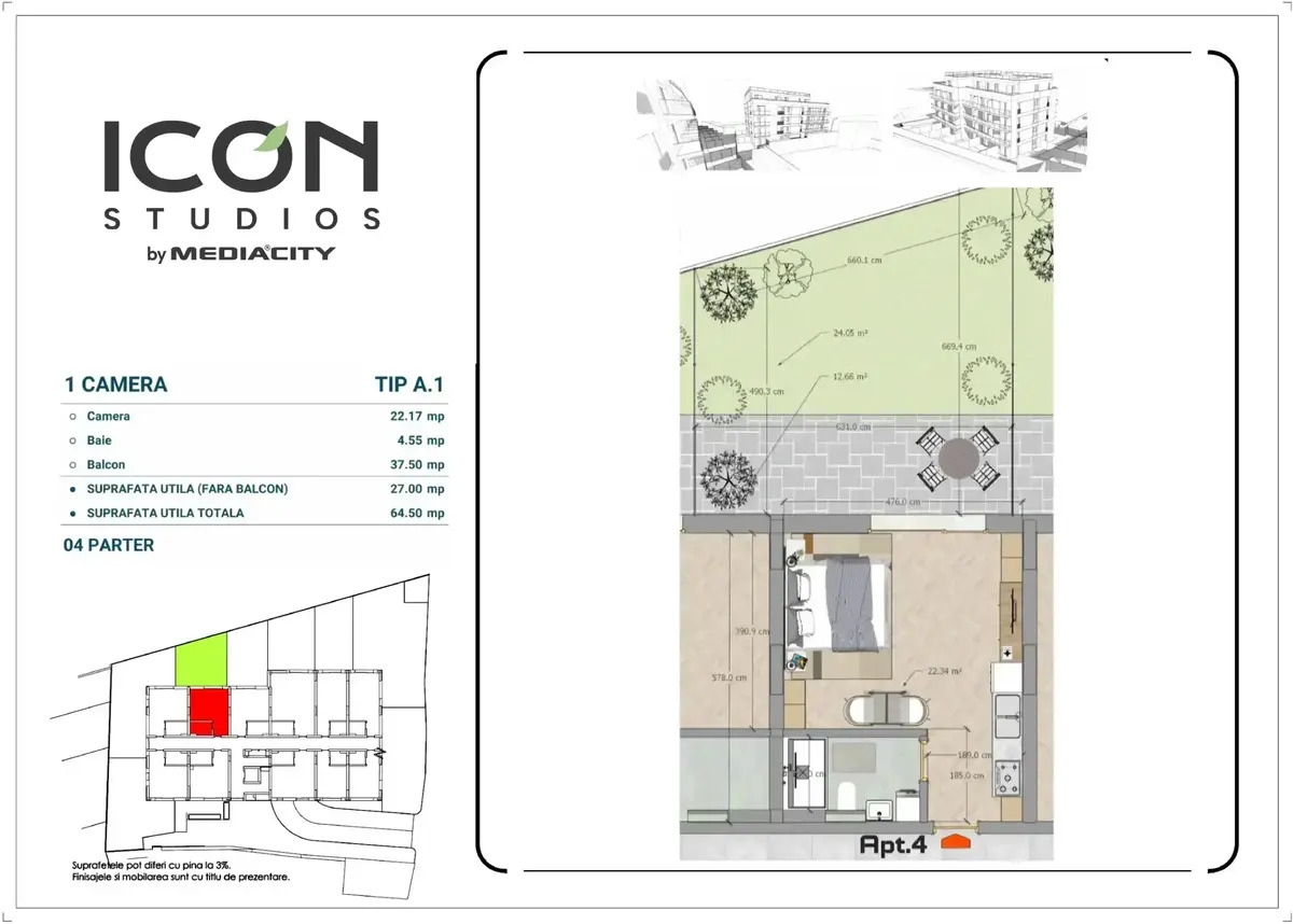 Garsoniera de vanzare. Aflata la parter, cu o suprafata utila de 26,72 mp, construita 32,17 mp, totala 64,11 mp, avand o gradina de 37,39 mp si o baie. Locuinta este intr-un imobil de 4 etaje.