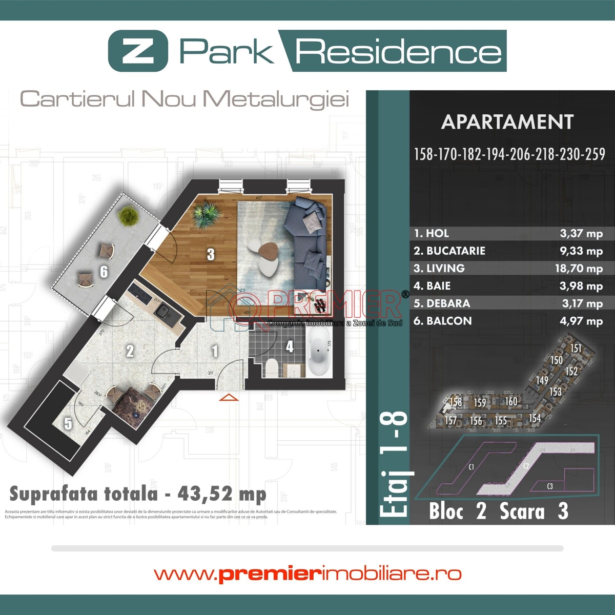 Va propunem spre vanzare o garsoniera moderna de 43,52 mp, situata in complexul rezidential Z Park Residence, in inima Cartierului Nou Metalurgiei. Blocul este in constructie si respecta toate standardele actuale, avand structura pe cadre de beton, cu pereti exteriori si compartimentari interioare din caramida Porotherm, pentru o izolatie fonica si termica superioara.