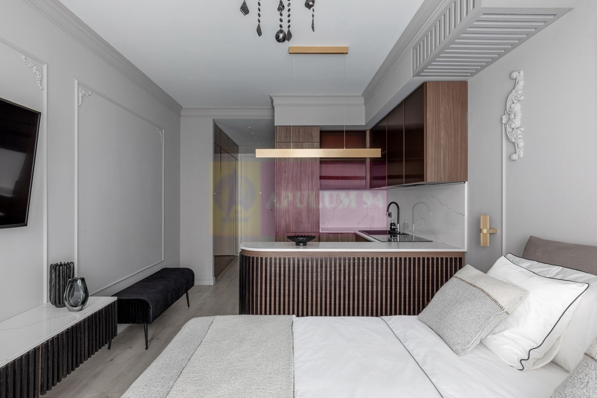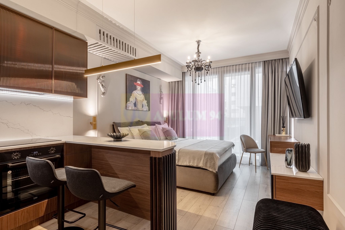 Studioul este situat la parterul inalt al unei cladiri din Win, avand vederea spre curtea interioara. Acesta a fost gandit ca o camera de hotel de 5 stele, fiecare detaliu fiind atent ales pentru a oferi confort. Toate materialele folosite, precum si electrocasnicele si obiectele de decor sunt premium.