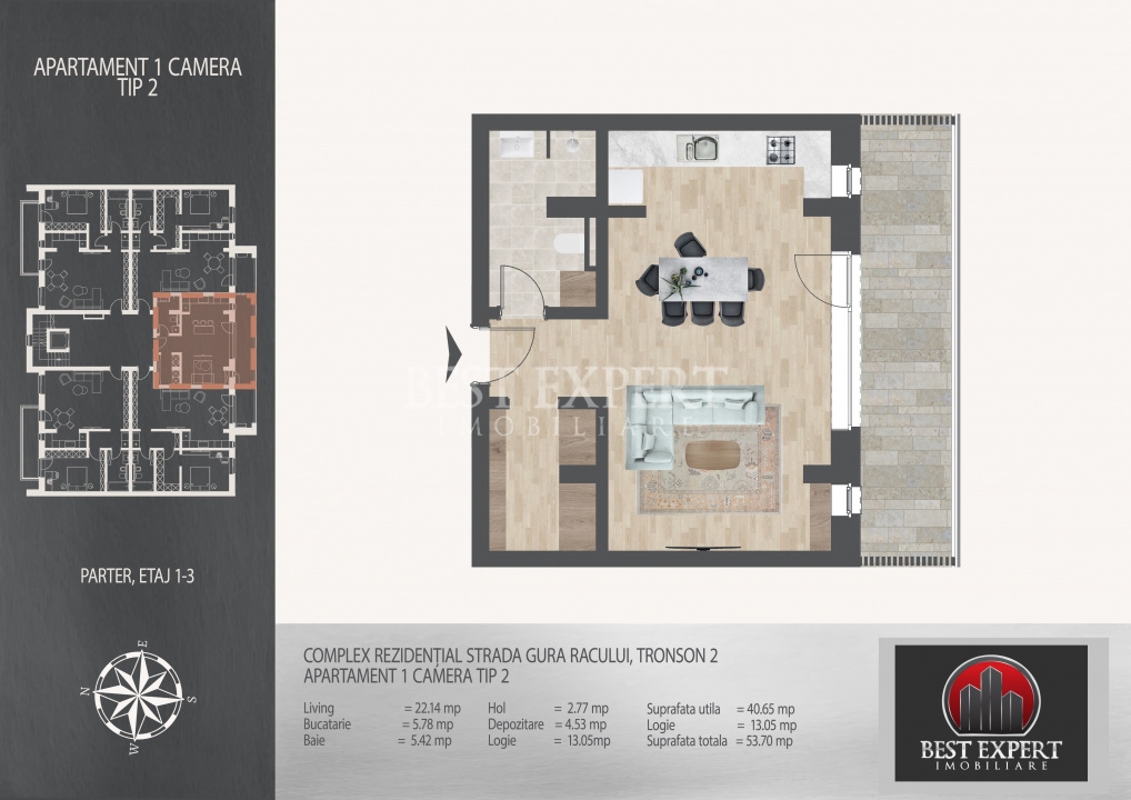 Suprafata utila - 40.65 mp utili +13.05 mp balcon, total 53.7 mp utili