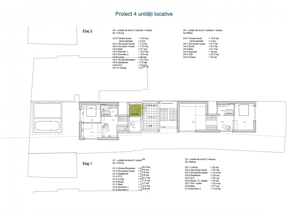 Proiect 4 unitati locative, P+2E+M: Suprafata teren = 463(443)mp. 4 unitati de locuinte cu gradini incluse, 3 camere fiecare + loc de parcare. Suprafata construita la parter = 206mp POT = 44.5% CUT = 1.45. CUT maxim P+2E = 1.3, CUT maxim P+2E+M = 1.57, POT maxim = 45%. Detalii arhitecturale atasate.
