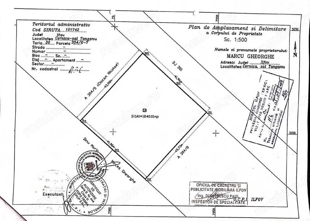 teren in Cernica Tanganu, 1840 mp, deschidere 42x44 mp la soseaua principala DJ301, toate utilitatile: gaze, curent, bransament de apa si canal sunt in fata terenului. Terenul este situat intre case noi construite. De la metrou Anghel Saligny (zona comerciala Pallady) pana in fata terenului se fac maxim 10 minute! 5 minute pana la fashion house Pallady, statie STV care merge pana in Bucuresti Pantelimon, 5 minute Manastirea Cernica, Aventura Park Cernica. Terenul este pretabil pentru constructie casa dar si pentru sediu de firma avand deschidere la soseaua principala DJ301. Satul Tanganu va fi legat de Autostrada Soarelui anul acesta printr-un drum de 8 km care este aproape finalizat. Vis a vis de teren se va construi un cartier de case, deci zona este in continua dezvoltare. Se poate cumpara si jumatate 920 mp.