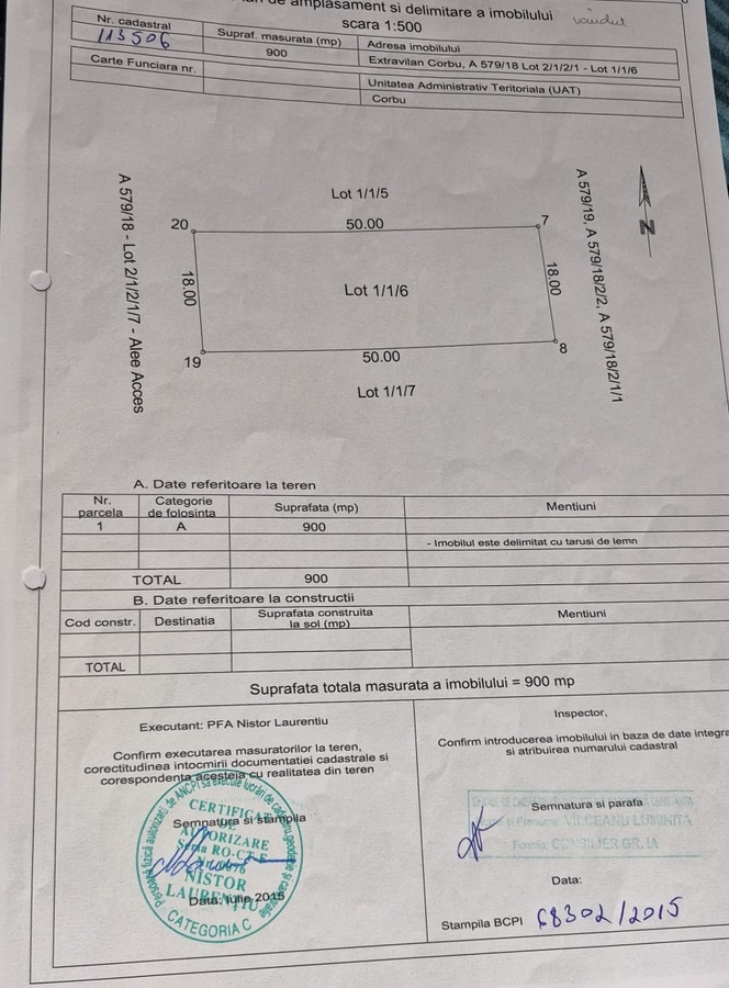 teren intravilan langa restaurante , 1.600 mp deschidere 40 m,cadastru, intabulare, 100 euro mp la 200 m de plaja Corbu