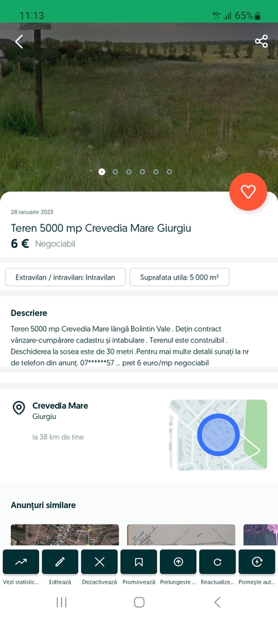 teren 5000 mp Crevedia Mare langa Bolintin Vale. Detin contract vanzare-cumparare cadastru si intabulare. Terenul este construibil. Pentru mai multe detalii sunati la nr. de telefon din anunt. 6 e negociabil.