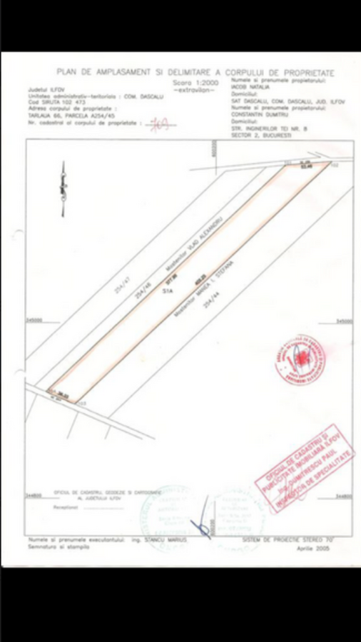 13000 mp, in intravilanul din Dascalu - Creata, cu proiect parcelare daca doriti dezmembratea, deschidere generoasa de 54 ml, la asfalt- drumul spre Creata si inchidere de 36 ml, T:66. Terenul este situat imediat la iesirea din Dascalu, la drumul spre Creata si se poate parcela in 20 de loturi de cate 553 mp cu drum adiacent, dublandu-va investitia. Se poate trimite schita parcelarii daca sunteti interesat! Zona este in plina dezvoltare. Terenul se afla situat la N-E Bucuresti, cca 400 m de reteaua electrica, 10 min. de centura Bucuresti, 25 min. de Colentina. Pretabil pentru investitie! Cel mai mic pret din zona Creata!