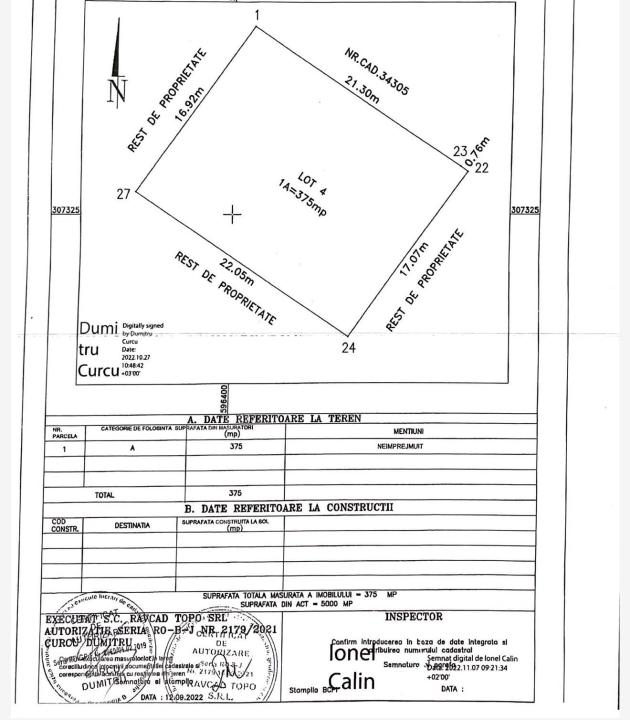 Suprafata terenului este de 375 mp, avand avantajul de a fi deja imprejmuit cu gard solid din placi de ciment, ceea ce ofera un plus de siguranta si reduce costurile initiale pentru viitorul proprietar.