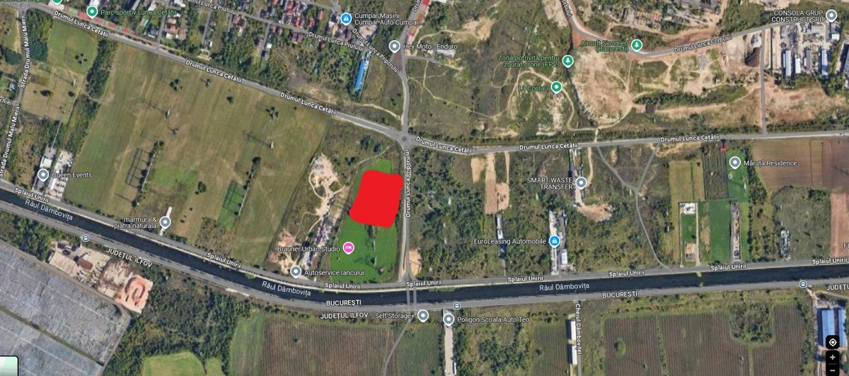Suprafata de 6450 mp (laturi aproximativ 80 x 80m), pozitionat fix la sensul giratoriu din intersectia Drumul Lunca Cetatii si Drumul Lunca Priporului, la cca. 150m de Splaiul Unirii si noul pod peste Dambovita de la Lunca Priporului. Iesire rapida si usoara la sosea. Cadastru + intabulare. Exclus agentii, rog nu insistati.