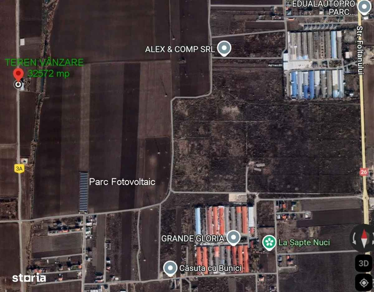 Acest teren are o suprafata totala de 18900 mp, beneficiaza de o deschidere de 33 ml (la doua strazi) si o localizare excelenta, fiind pozitionat: