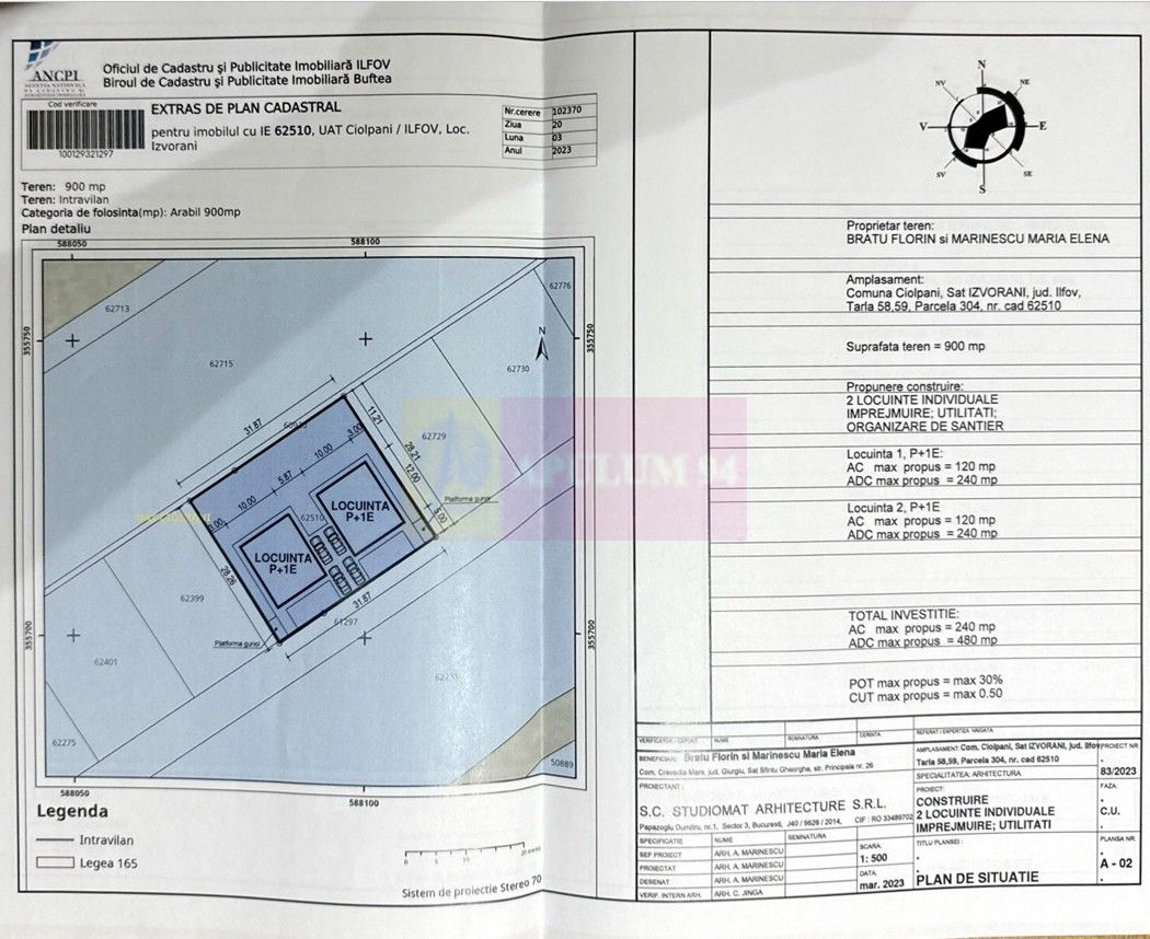 - Regim Urbanistic: POT max: 30%, CUT max: 0.50- Regim constructii propus: Doua locuinte individuale P+1E