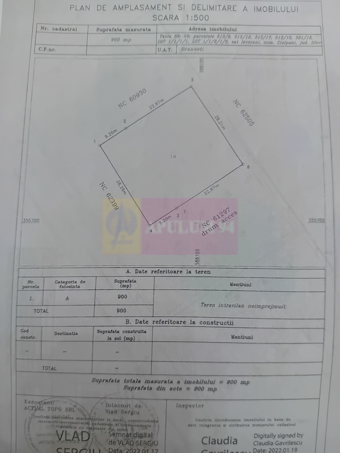 -Teren 900 mp, intravilan, cu forma regulata si deschidere 22.6m, potrivita pentru proiect rezidential.