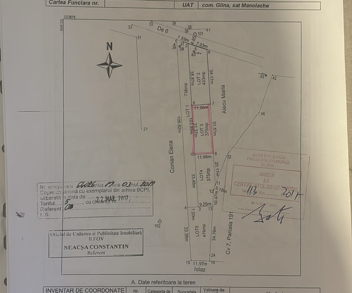 Teren 540 mp din care 140 de mp servitute, deschidere 31.57 / 11.88, regim de inaltime P+2, gaze, curent, apa, canalizare, acces zona Pallady sectorul 3, A0, A2, centura, Catelu, lot de 4 terenuri din care sunt construite doua case. Pot 35, Cut 1.05