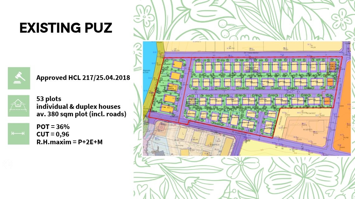 Proprietatea are o suprafata totala de 19.974 mp si beneficiaza de PUZ aprobat si valabil, care reglementeaza o dezvoltare unitara pe 53 de loturi, cu densitate moderata, adaptata contextului construit existent. Sunt permise locuinte individuale si locuinte cuplate, cu suprafete ale parcelelor cuprinse intre 250 si 577 mp, oferind flexibilitate in optimizarea mixului de produs.