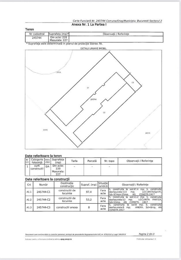 Oferim spre vanzare un teren intravilan, cu potential in oras, zona Obor-Colentina, pe str. Seneslav Voievod, cu o suprafata de 220 mp, deschidere 10.5 ml. Pe teren exista 2 corpuri de cladire: unul care necesita consolidare totala, care are si beci, 3 camere, si celalalt corp, care este construit in anul 1970, care are o camera, bucatarie si baie. Toate utilitatile sunt pe teren: gaz, apa, curent, canal. Zona este de case, aproape de mijloace de transport. Toate actele sunt la zi, pret usor negociabil. Reper: Obor - Kaufland.