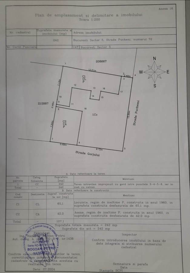 Vand teren intravilan 242 mp si casa formata din 3camere, baie, bucatarie, hol demolabile in suprafata de c1 65.1 mp, anexa c2 42 mp situat in strada pucheni nr72 sector 5 Bucuresti cartier Rahova. Terenul are 2cai de acces in strada pucheni suprafata de deschidere 15.6 m si strada Gorjului suprafata de 16m. Este racordata la energie electrica, gaze, apa curenta, canal. Suprafata terenului este de 242 mp. anul constructiei 1960. cadastrul facut in 07.2024. Pentru mai multe detalii tel.