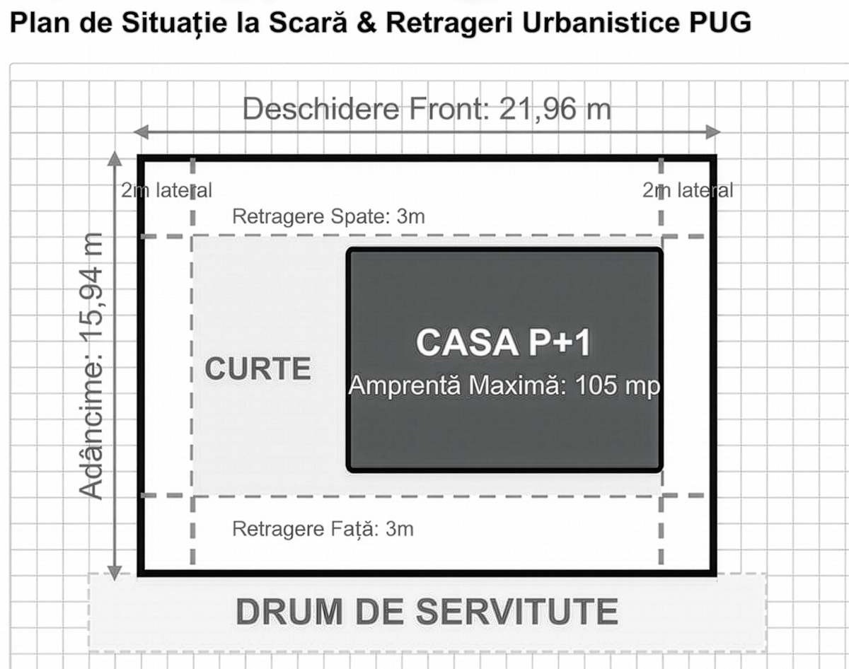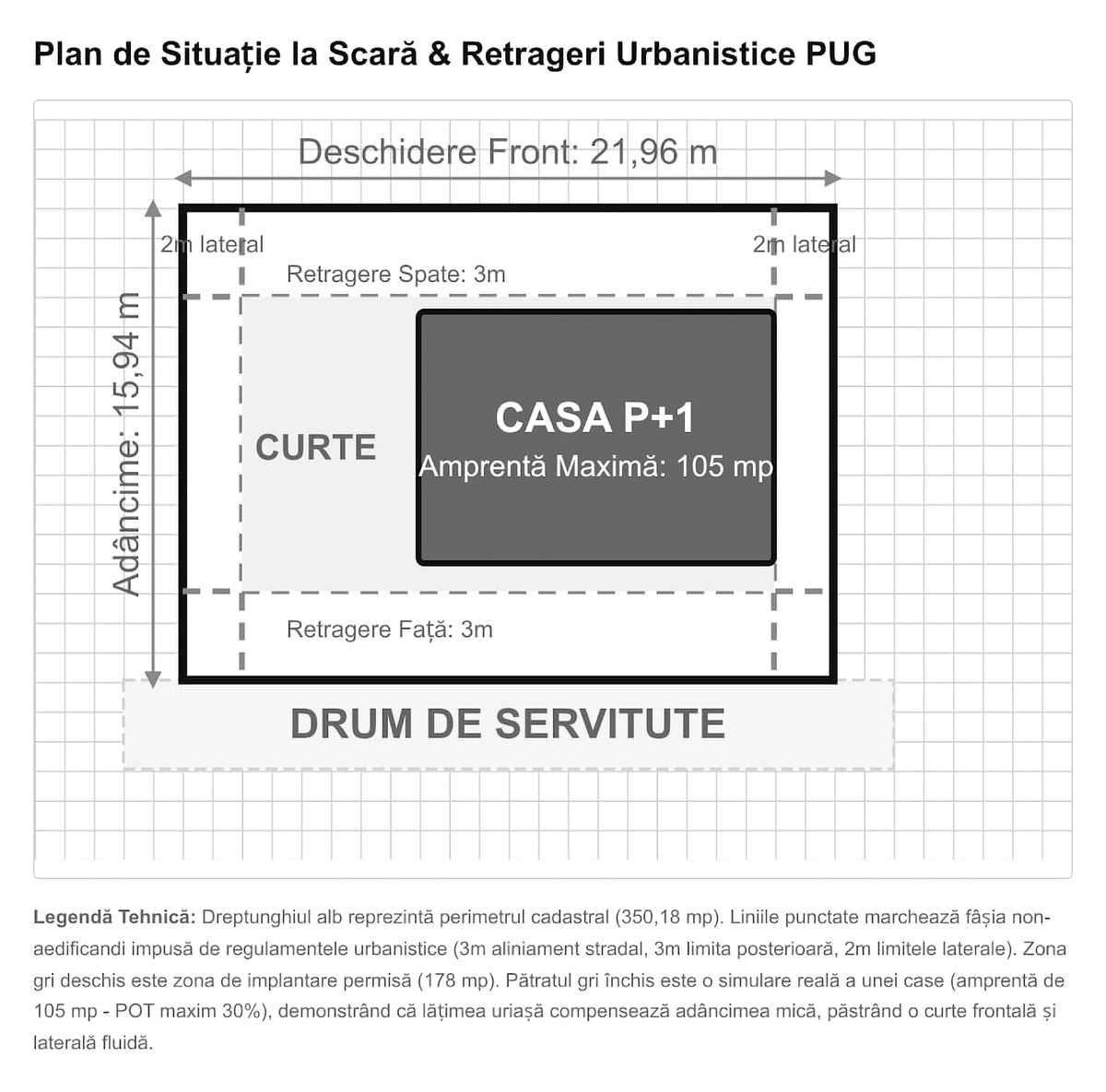 ✅ Deschidere exceptionala de 21,96 m: Spre deosebire de loturile inguste ("tip vagon") frecvente in Ilfov, aceasta geometrie va permite sa construiti o vila impunatoare desfasurata pe latime (amprenta de pana la 105 mp), lasand un spatiu vast si perfect proportionat pentru curte, terasa si 2 locuri de parcare.