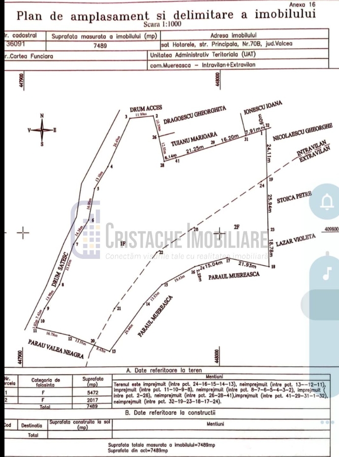 Terenul are o suprafata totala de 7489 mp, din care 5472 mp intravilan si 2017 mp extravilan, si se afla localizat in Sat Hotarele (Comuna Muereasca), Jud. Valcea.