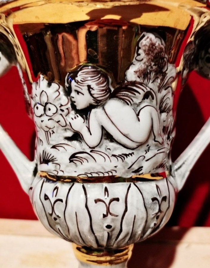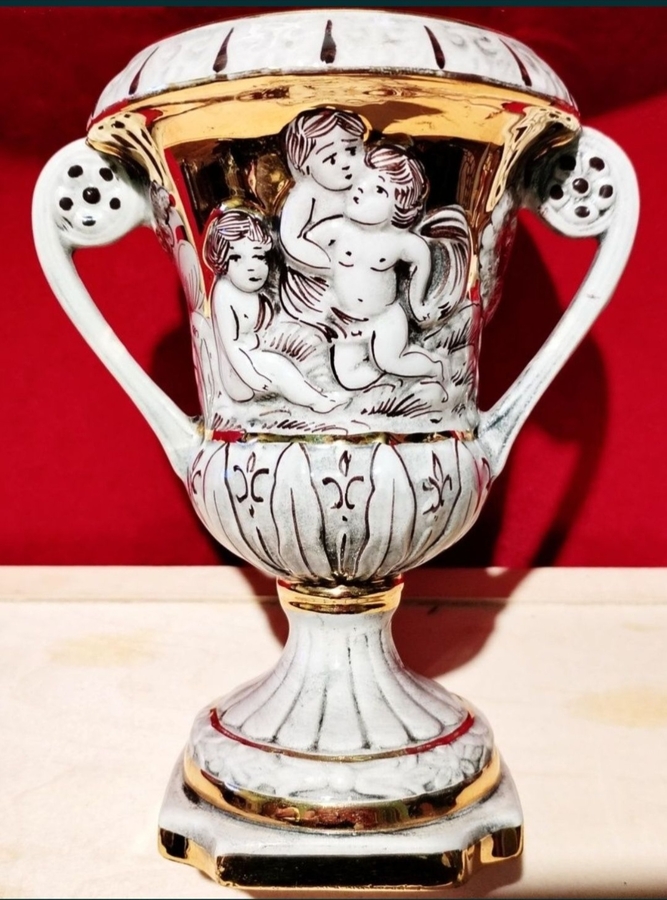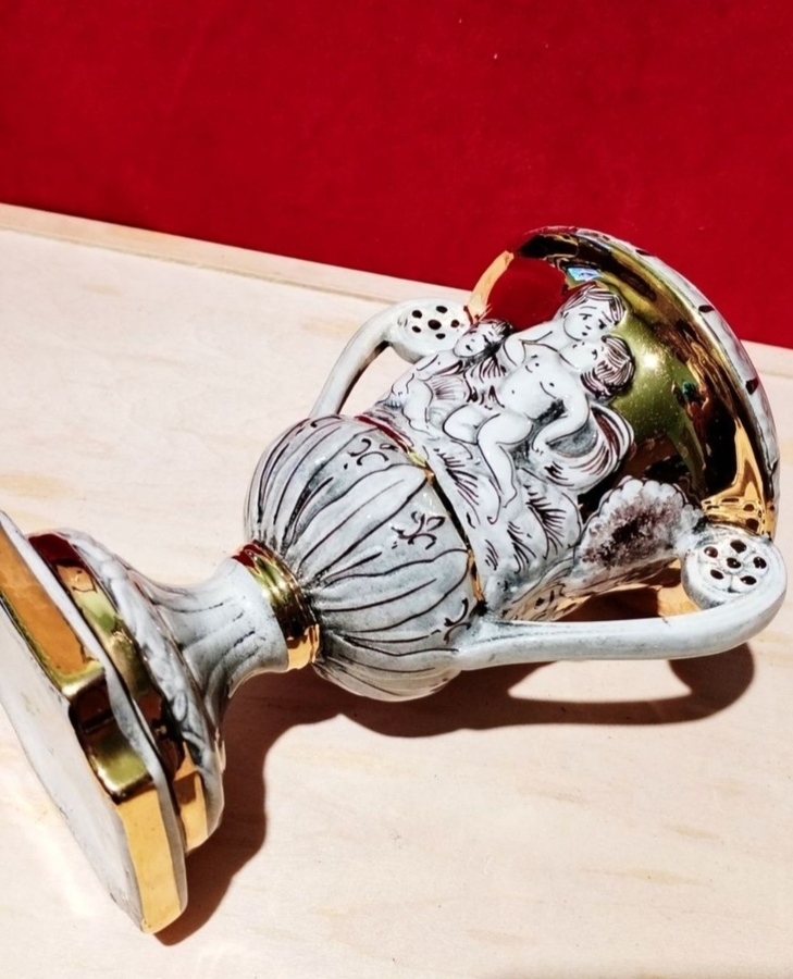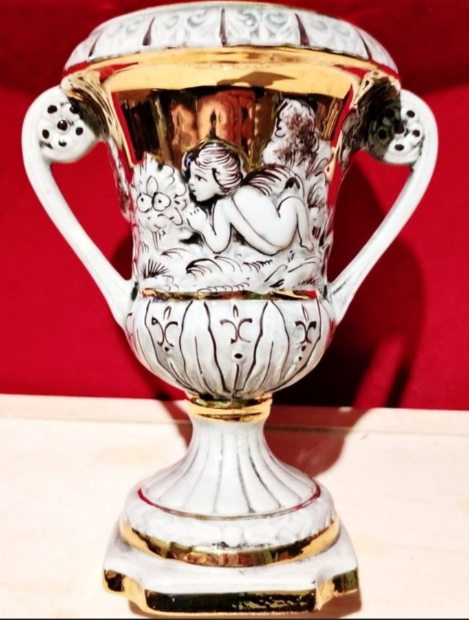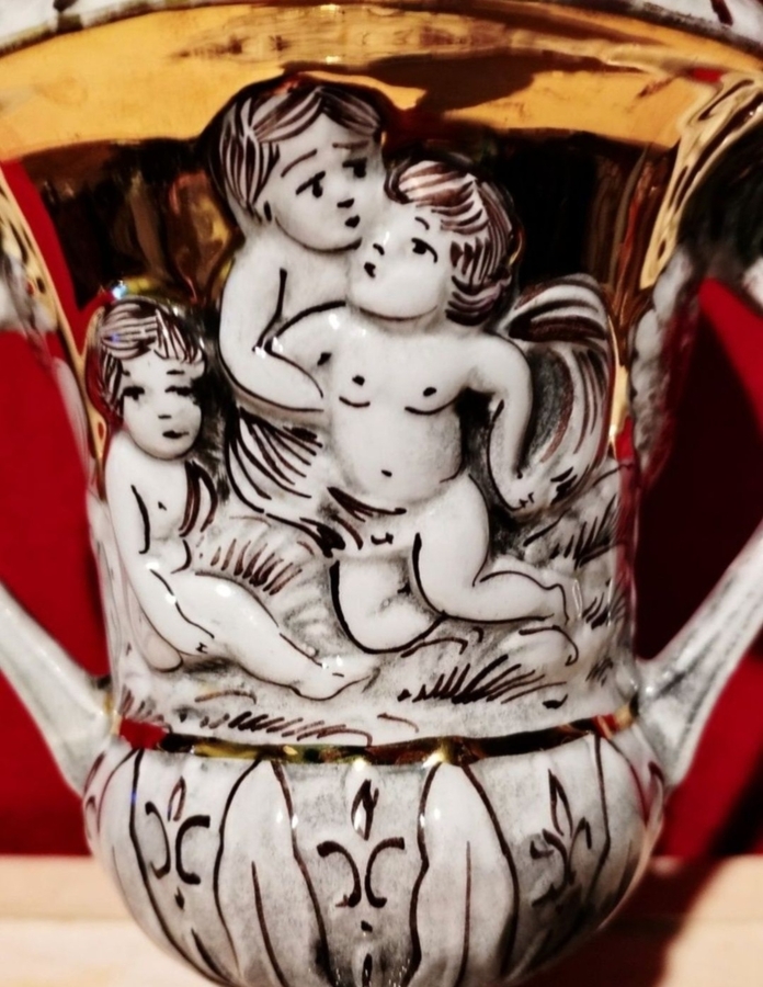 Vaza decorativa din portelan Capodimonte, fabricata in Italia, anii 1960, cu detalii aurite si reliefuri superbe cu ingerasi (putti).