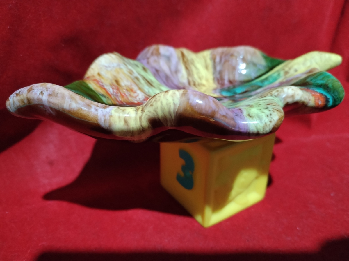 Decor incantator, realizata sub forma de frunza din ceramica emailata, plina de culoare.