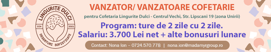 Cofetarie angajam cofetar pentru laboratorul din Sectorul 6. Programul este in ture, iar salariul variaza in functie de experienta. Daca aveti...