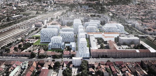 Zona este situata într-o zona predominant industriala: parcela a gazduit Fabrica Elba din Timisoara, fondata în 1921, ulterior relocata în parcul industrial Freidorf, iar în 2017 a început demolarea cladirilor.